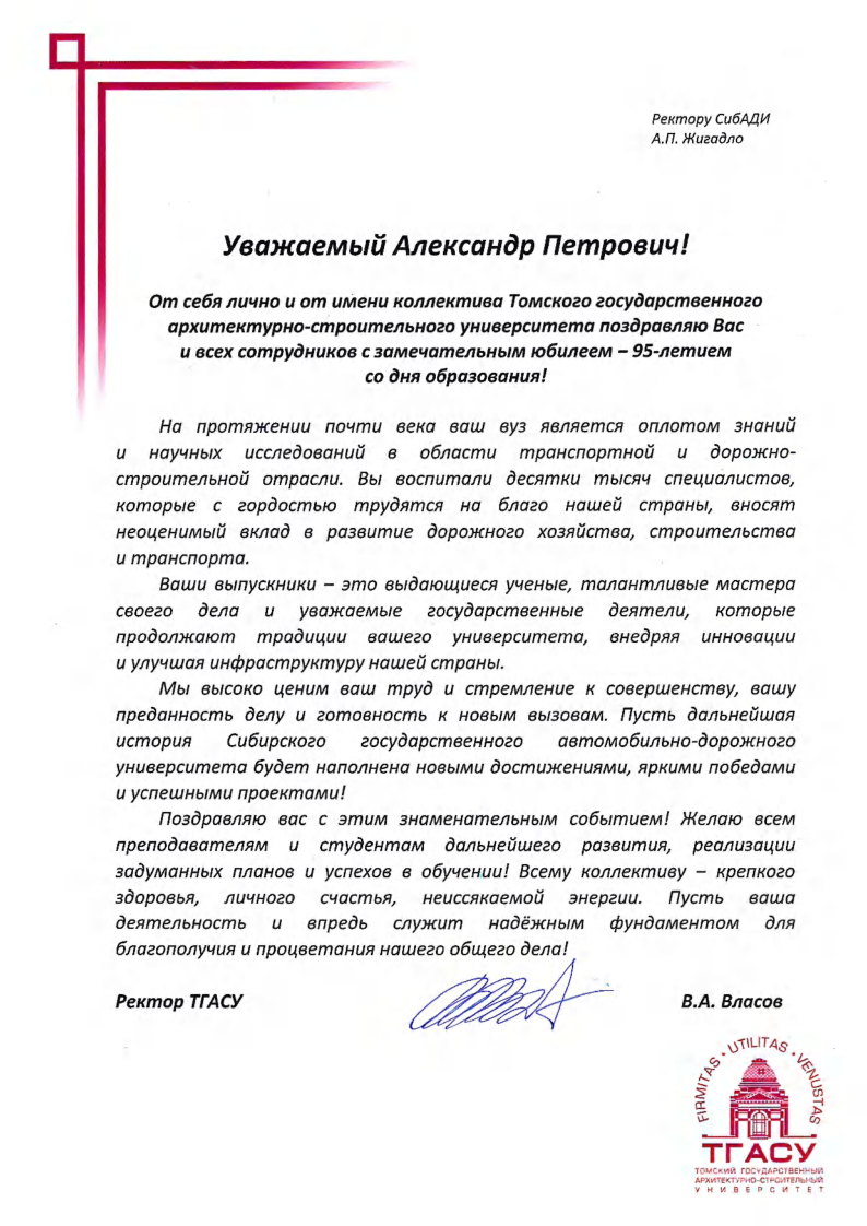 Хотел бы от себя лично и от выпускников 2003 г. факультета «Автомобильные дороги и мосты» поздравить родной СибАДИ с солидным и славным юбилеем!