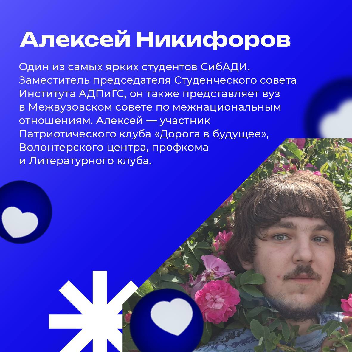 Алексей Никифоров — один из самых ярких студентов СибАДИ. Заместитель председателя Студенческого совета Института АДПГС, он также представляет вуз в Межвузовском совете по межнациональным отношениям. Алексей — участник Патриотического клуба «Дорога в будущее», Волонтерского центра, профкома и Литературного клуба.